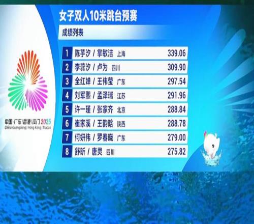 北京时间11月6日,在刚刚结束的第十五届全运会女子双人十米台预赛上,上海队的陈芋汐和掌敏洁以339.06分排名第...
