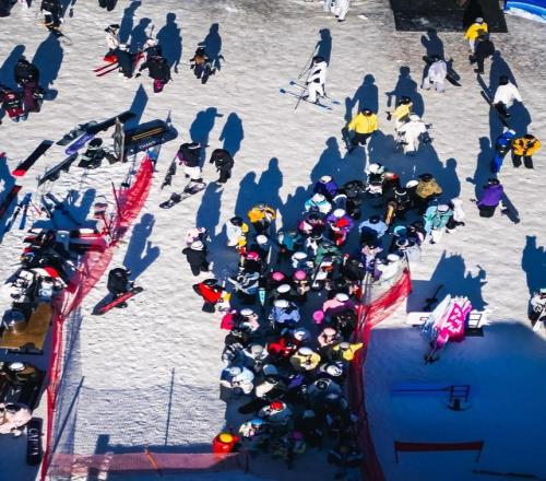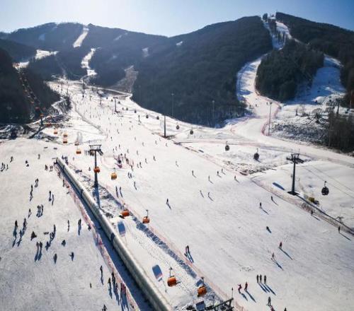11月22日,滑雪爱好者在吉林市中旅松花湖度假区排队乘坐缆车(无人机照片)。 新华社记者 许畅 摄