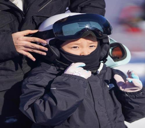 11月22日,小朋友在吉林市中旅松花湖度假区滑雪前佩戴雪镜。 新华社记者 颜麟蕴 摄