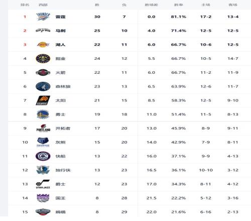 雷霆输球后2连败,战绩30胜7负排名联盟第一,雷霆本赛季前25场赢了24场,随后的12场比赛输了6场,按照这个趋势,他们本赛季的战绩可能超不过上赛季的68胜了。